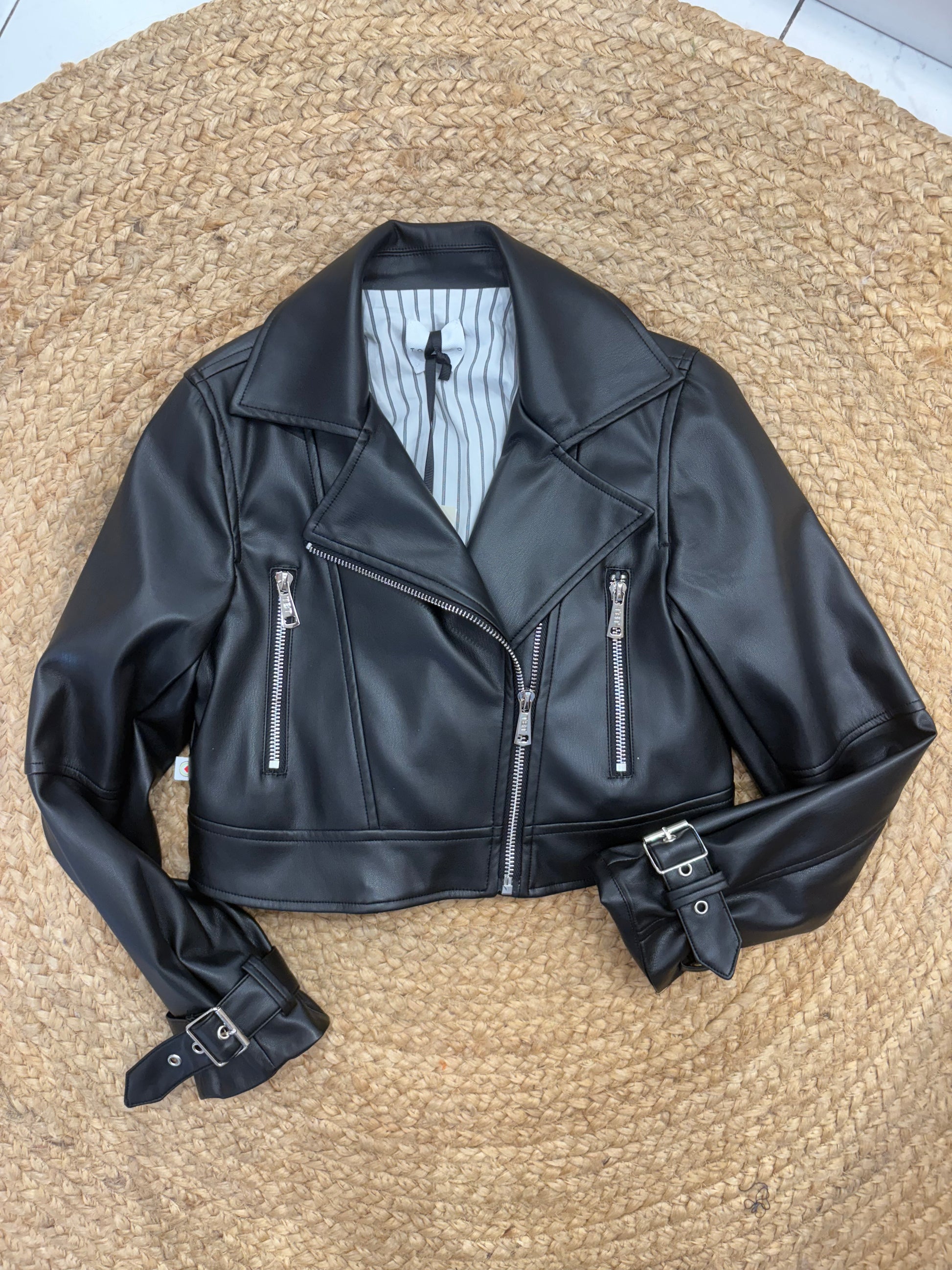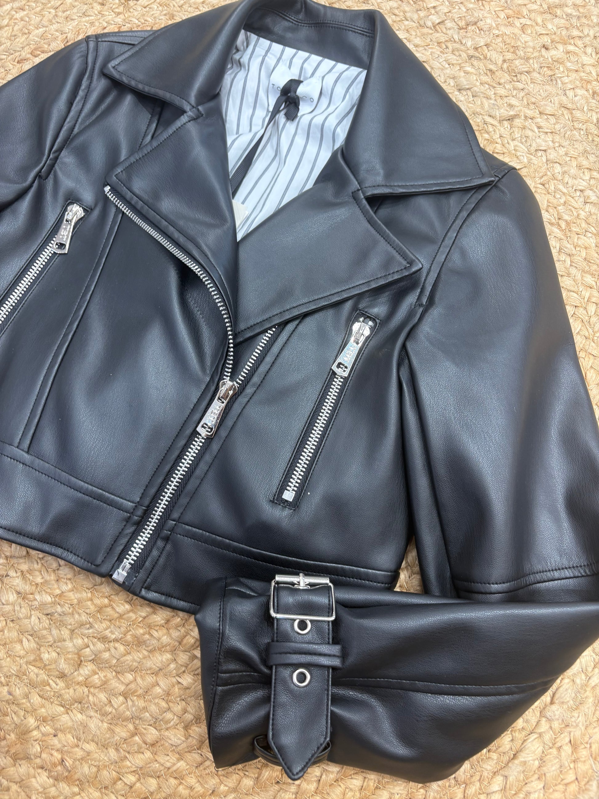 Chiodo in ecopelle morbidissima cropped con fibbie sui polsi.