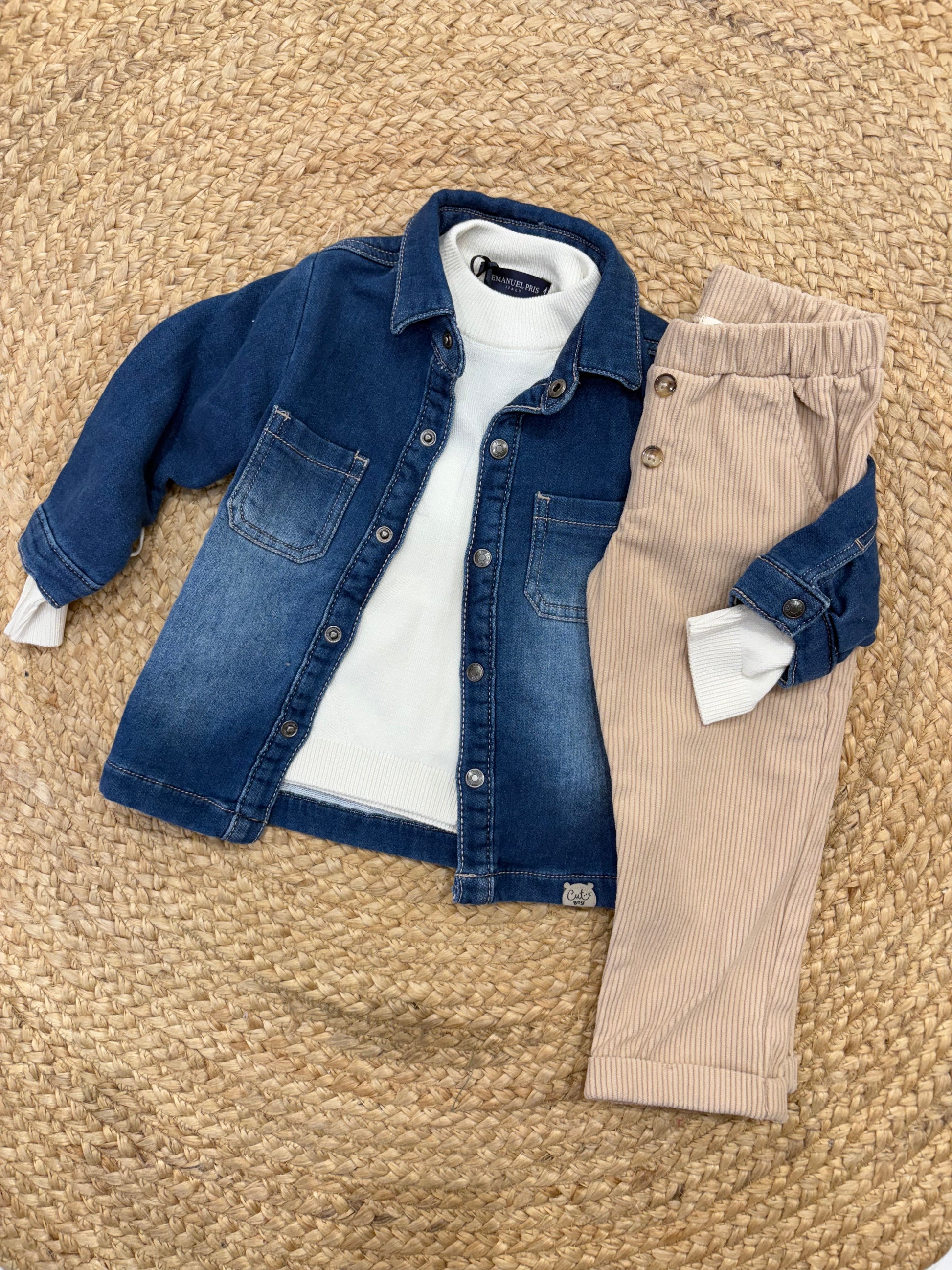 Completo da 3 pezzi composto da camicia in cotone effetto denim + lupetto in viscosa + pantalone in velluto a coste