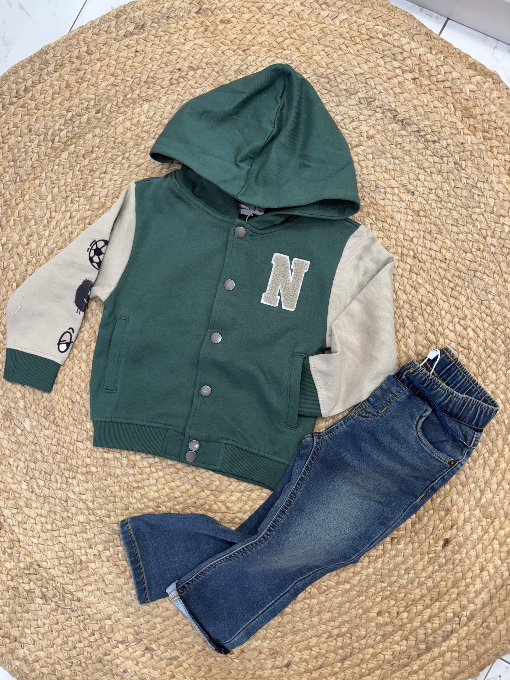 Completo da 2 pezzi composto da felpa felpata + pantalone in cotone effetto denim