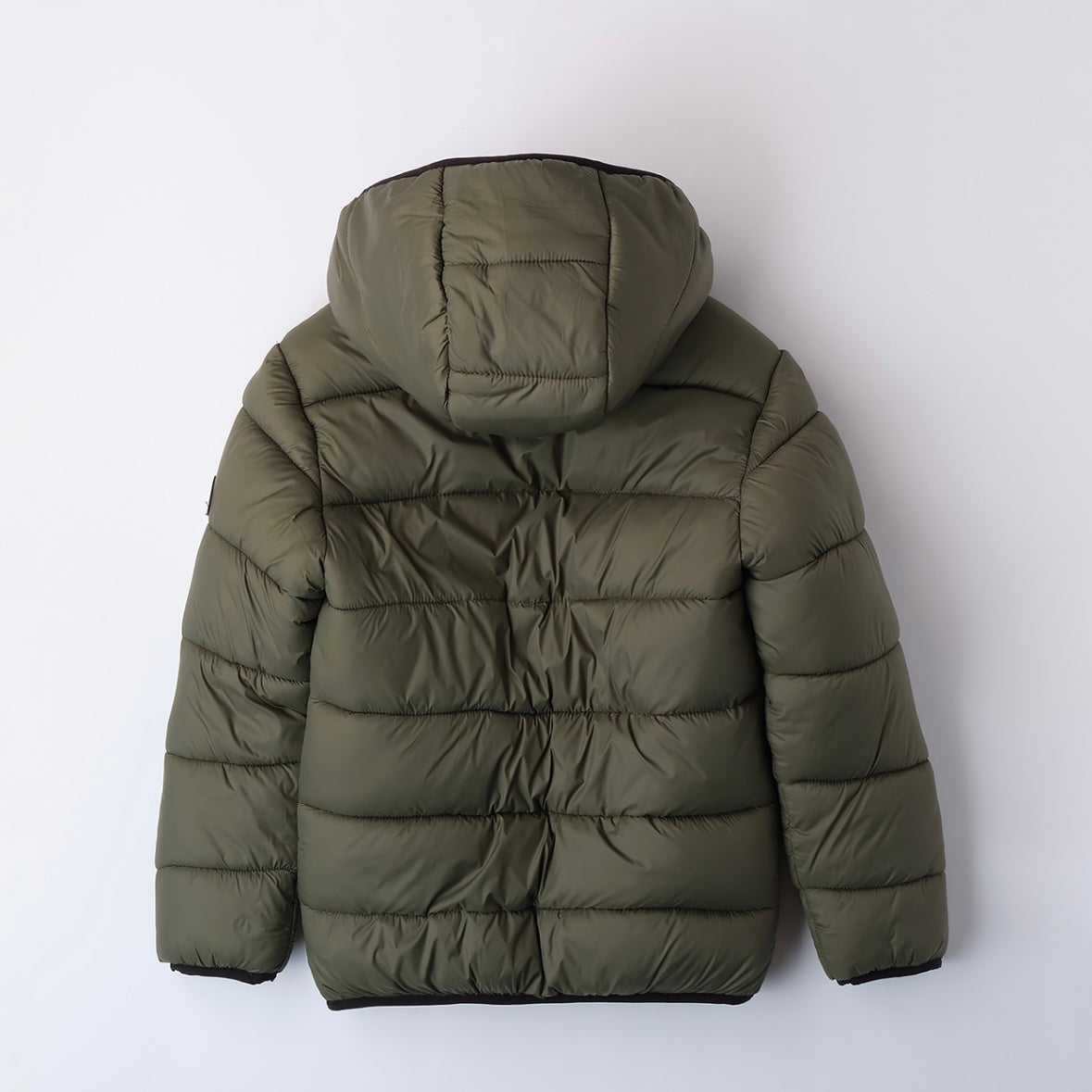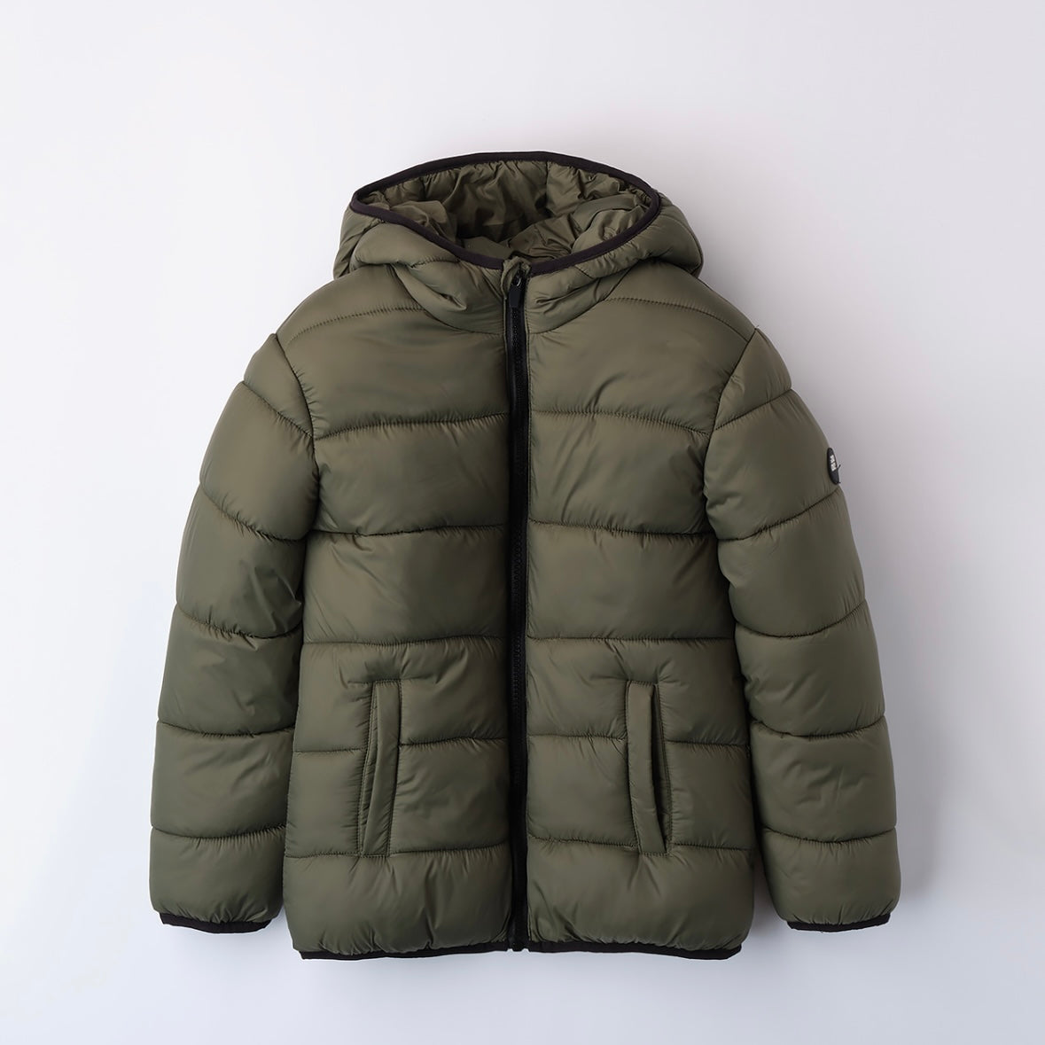 Giubbotto in nylon imbottito in ovatta. Il modello presenta apertura con zip, comodo cappuccio, tasche laterali con zip ed è in fantasia tinta unita. Fodera in pile.