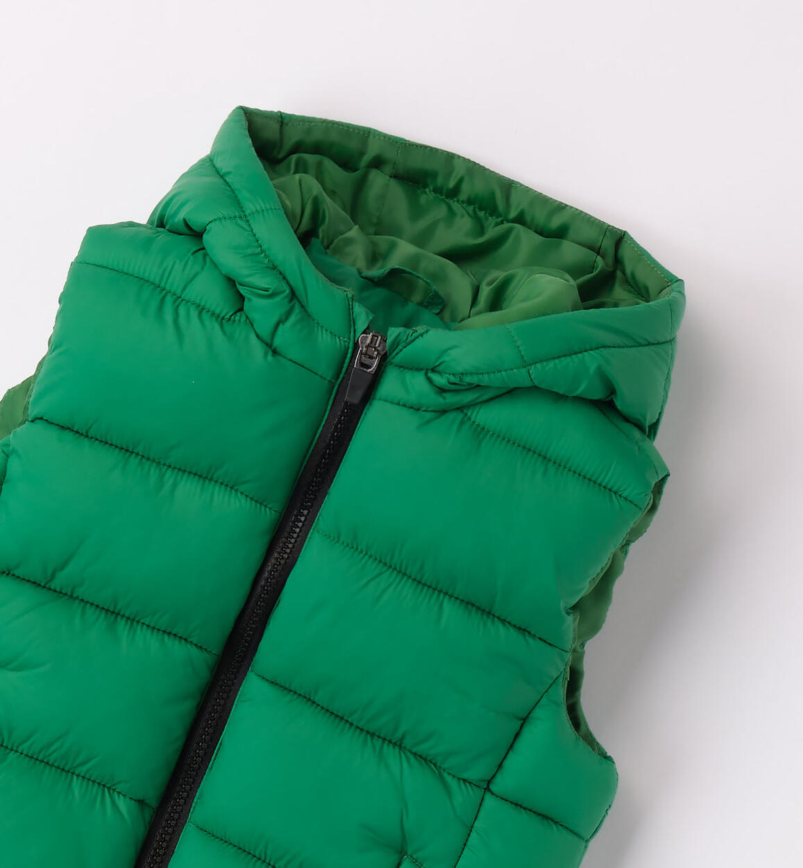 Gilet per bambino realizzato in nylon con imbottitura in ovatta. Il modello ha il cappuccio, tasche e dettagli a contrasto. Apertura con zip. Pesantezza 200 grammi